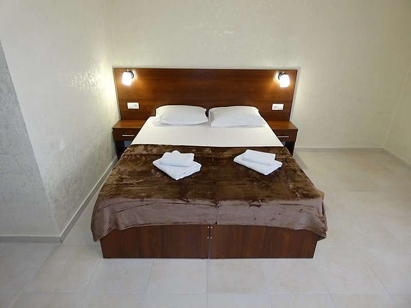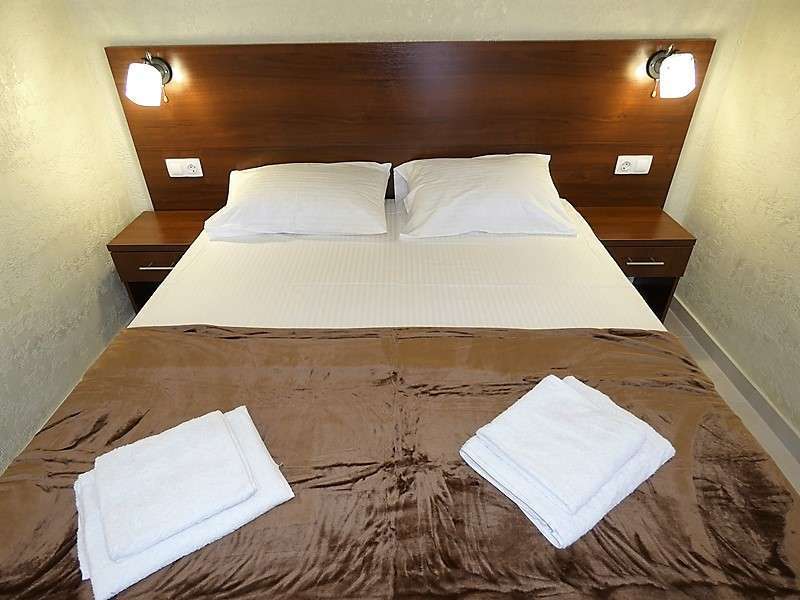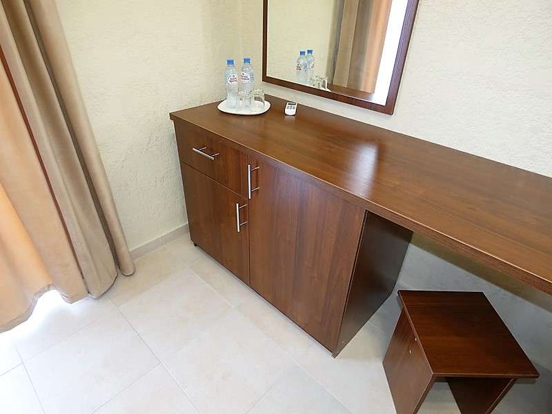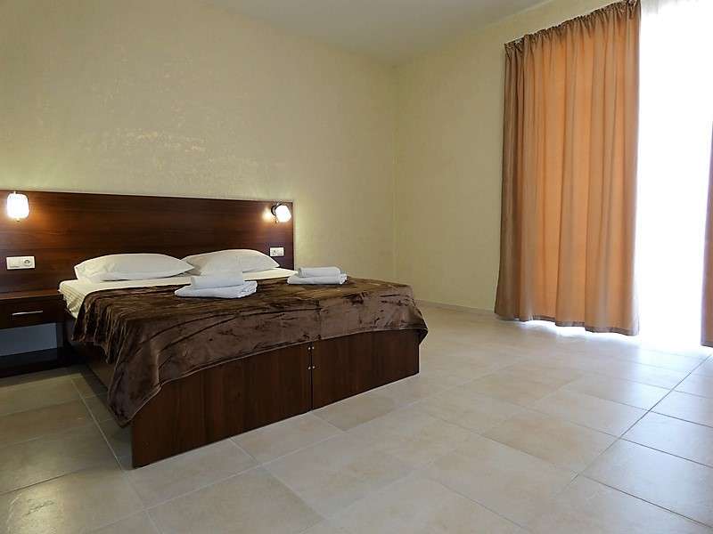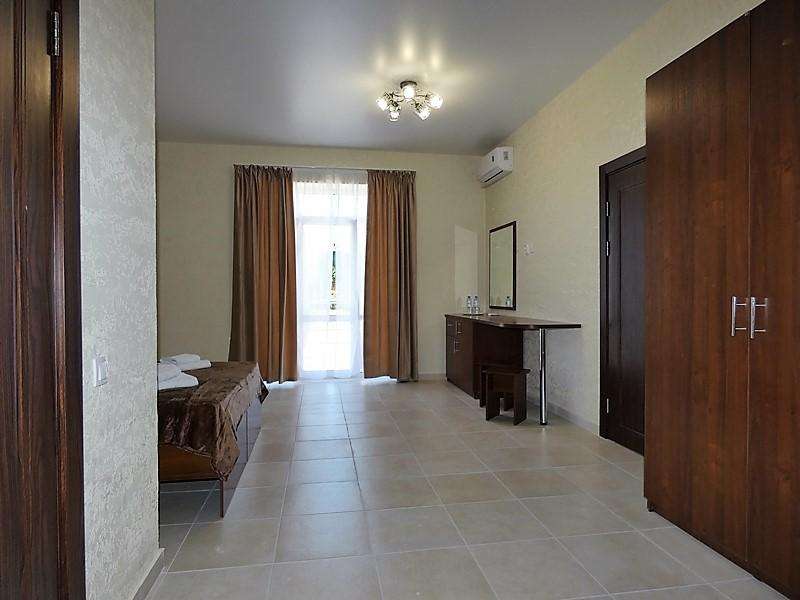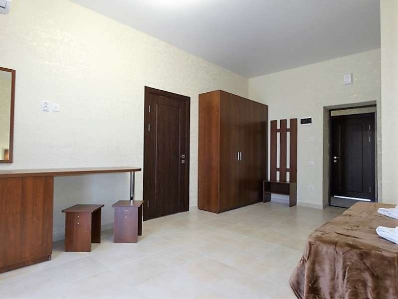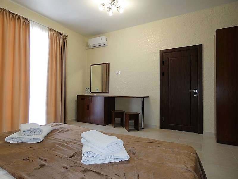 шкаф, стулья, тумбочки, кровати односпальные, кровать двуспальная, диван-кровать, кресло, туалетный столик, вешалка, балкон, посуда